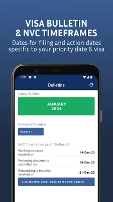 Optimisez le suivi de vos dossiers d'immigration et de citoyenneté USCIS & NVC aux États-Unis. Accédez instantanément aux derniers Bulletins de Visas et restez informé grâce à des notifications push en temps réel. Gérez facilement vos démarches et ne manquez aucune mise à jour cruciale.
