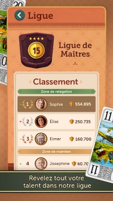 L'aventure ne s'arrête jamais sur Tarot Classique. Gravissez les échelons d'une ligue dynamique pour prouver votre suprématie et affirmer votre statut d'as du Tarot. Profitez d'une atmosphère de jeu sans égale, sublimée par des graphismes en haute définition qui rendent chaque partie visuellement captivante. Nos fonctionnalités communautaires vous permettent d'interagir avec vos partenaires et adversaires via un chat convivial, agrémenté d'émojis et de phrases préétablies. Et le meilleur ? Votre concentration ne sera jamais brisée, car Tarot Classique est fièrement dépourvu de toute publicité. Pour toute question, un support client dédié est toujours à votre écoute.